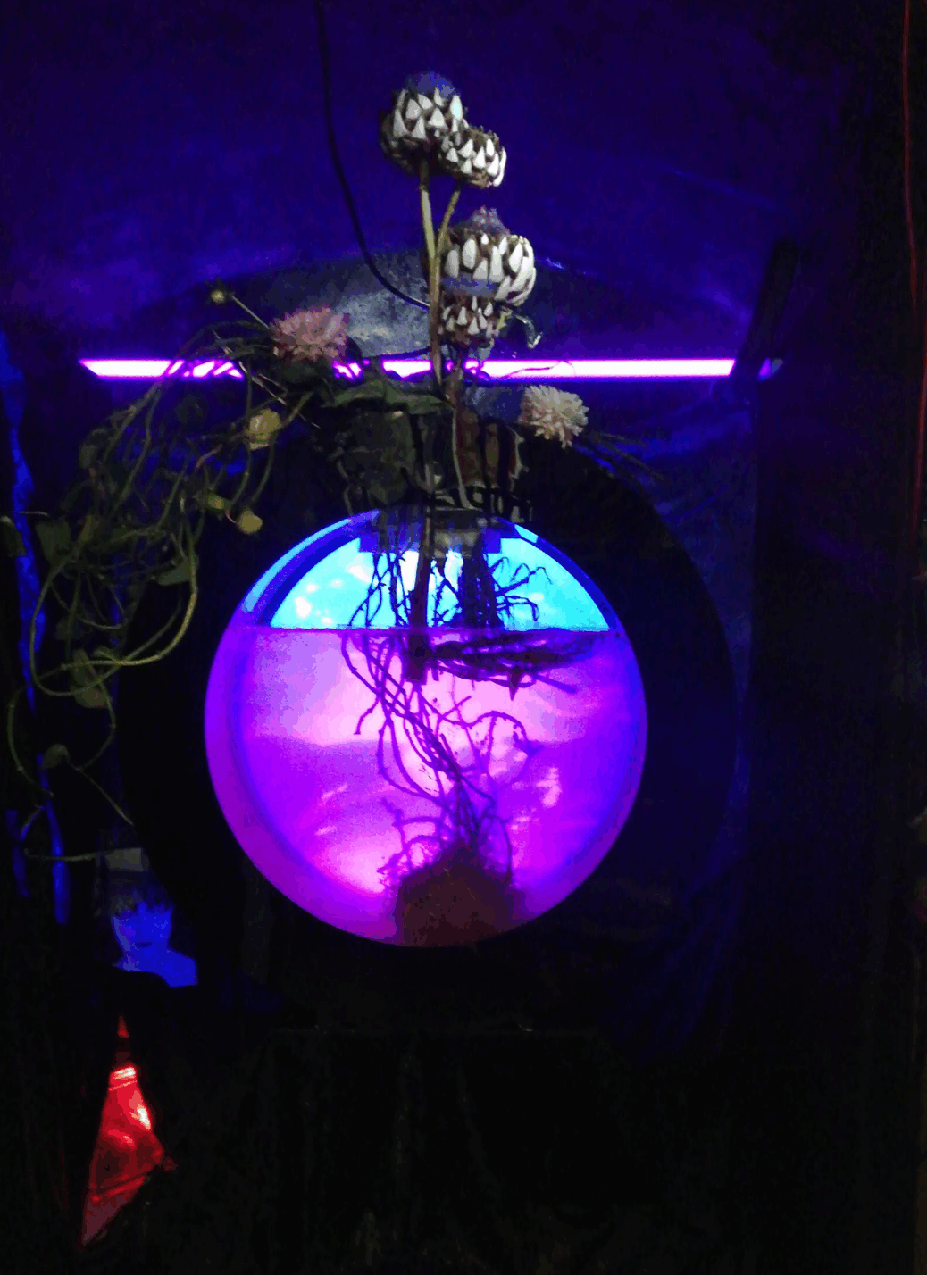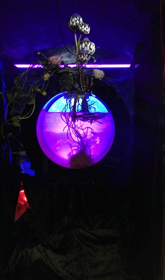A water world of mud, flowers, UV-light, sound and text are elements of the scenic storytelling – locked-in, nearly hidden and enclosed in the water chamber staged as a sanatorium, as an oasis of purification from darkness, as a poetic-occult laboratory for restoring truth.